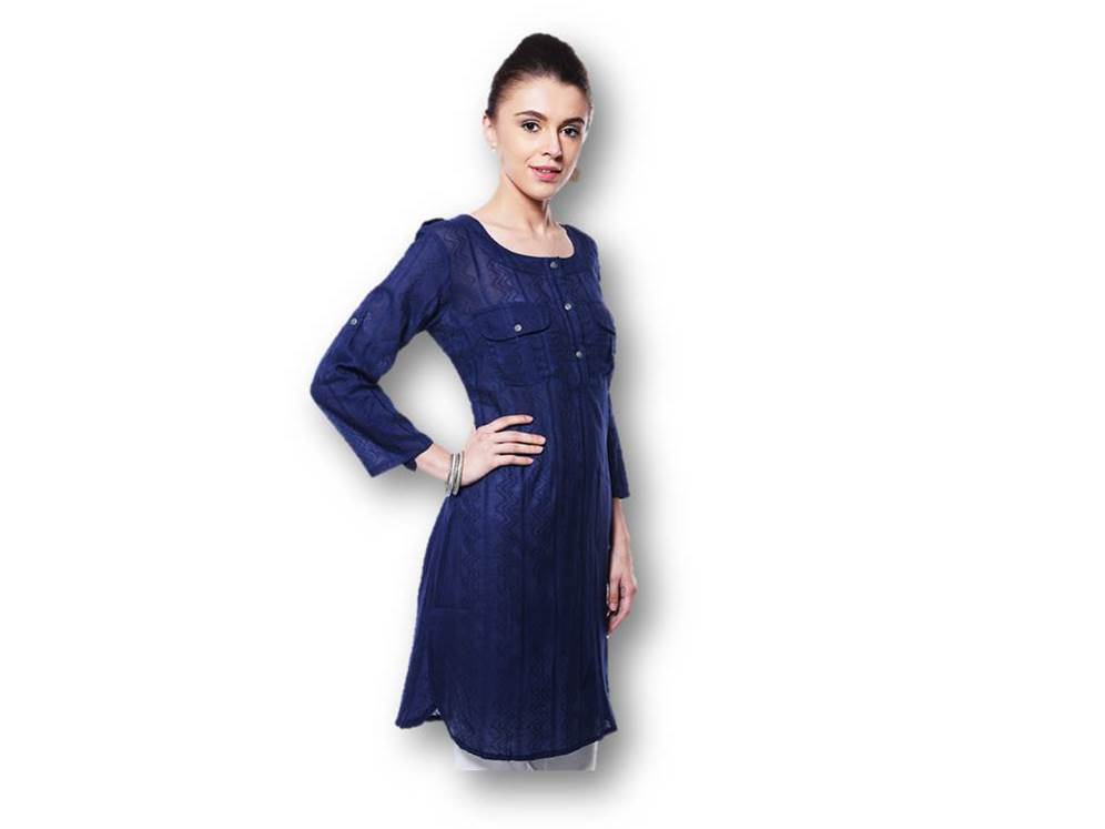 Meira 3/4 Sleeve Round Neck Blue Cotton Kurti
